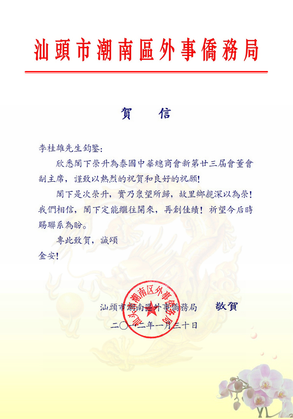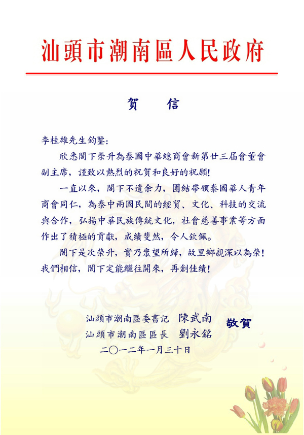 潮南区委陈武南书记、刘永铭区长贺李桂雄荣膺中总副
