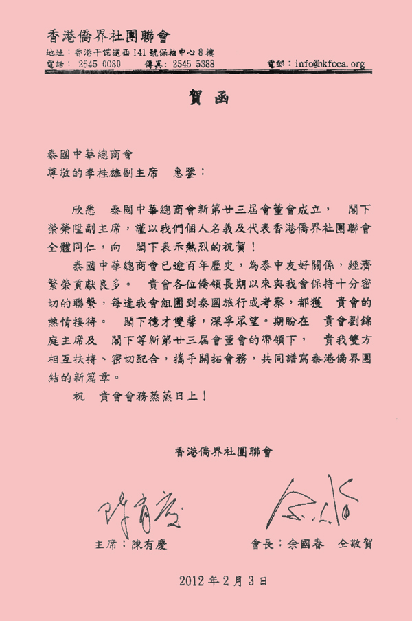 香港侨界社团联会发来贺函,贺李桂雄荣膺中总副主席