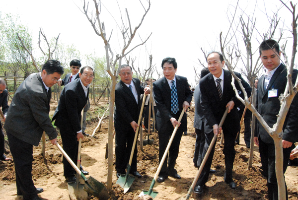 (左至右)青岛市黄岛区副区长孙大贵、中共青岛市委统战部王吉春副部长、李桂雄会长、周彬会长、陈家桂执行会长、黄宏武副会长等在开发区植树绿化时影。