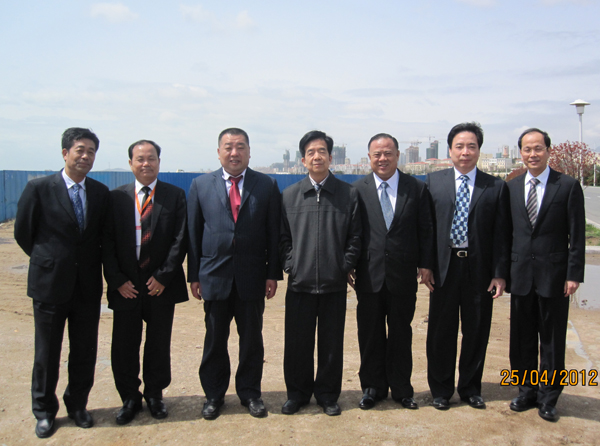 (左至右)香港潮商会郑和国名誉会长、山东潮商会郑松荣会长、泰华青商会顾问郑侧强、上海潮商会会长姚文琛、泰华青商会会长李桂雄、青岛潮商会会长周彬、执行会长陈家桂等考察西海岸开发区时合影。