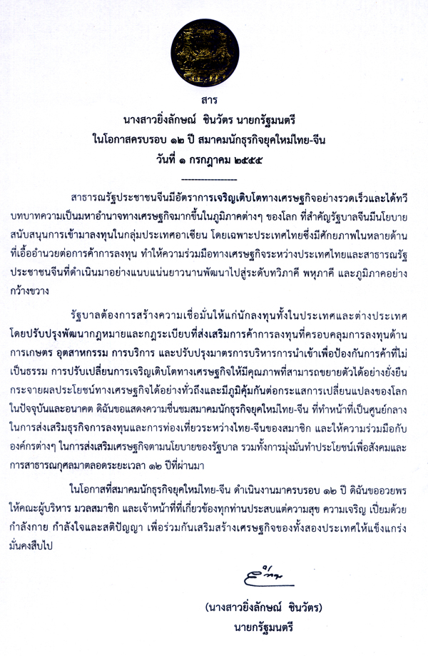 2012年7月1日,是泰国华人青年商会成立12周年纪念日,泰国国务院总理英拉•秦那瓦阁下为表扬和鼓励泰国华人青年商会在促进泰中友好经贸合作和推动泰中两国的公益慈善事业所做出的成绩。特发来了贺函,内容如下并翻译成中文。