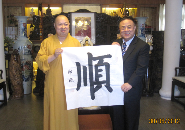 2012年6月30日,深圳弘法寺主持印顺大师会见了泰国华人青年商会会长李桂雄、顾问王益新一行。印顺大师引导李会长膜拜了已圆寂的本焕大师佛座,并赠送亲笔墨宝“顺”和纪念品给予李会长、王益新顾问等,保佑平安。会见中,印顺大师表扬泰国华人青年商会李桂雄会长及全体同仁不仅在促进中泰两国友好、经贸合作。而且在中泰文化、佛法佛学的交流宣传中做出了成绩。印顺大师是德高望重的“华僧大尊长”,受到泰中两国政商界以及佛教界人士崇拜和敬重。印顺大师鼓励李会长再接再厉,为中泰政府和民间各项事业的合作建立更大的平台,大师还为青商会和李会长祈祷,祝泰华青商会全体同仁幸福安康,事业蒸蒸日上,大家都感谢印顺大师,去年泰国洪灾时大师亲莅灾区救灾慰问灾民。