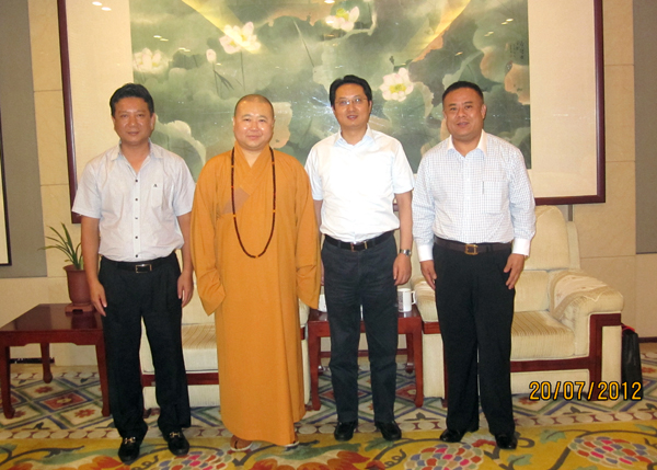 左起:泰华青商会赵春森顾问、上海玉佛禅寺觉醒方丈、共青团上海市委潘敏书记、泰华青商会李桂雄会长等合影。