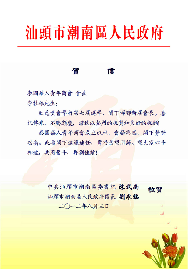 潮南区委陈武南书记、刘永铭区长贺李桂雄 蝉联青商会第七届会长