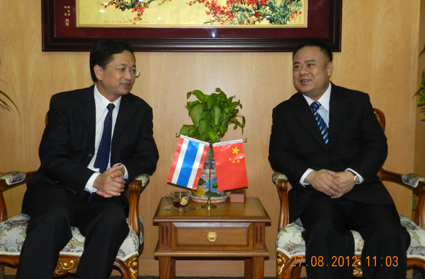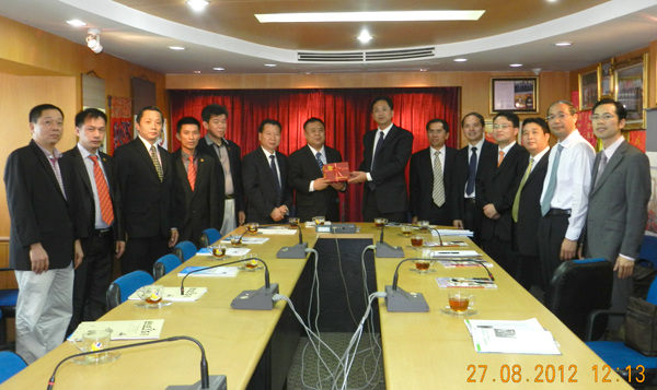 中国广西壮族自治区崇左市人民政府副市长张鸿先生率考察团成员温志标(市政府副秘书长),王方红(市工信委主任),严耀新(市外侨办主任),冯华勇(市商务局副局长)及陆相贵、谢明强、陈明华、甘聪颖一行,于2012年8月27日(星期一)上午访问泰国华人青年商会,受到青商会李桂雄会长偕林嘉南常务副会长、章永丰顾问、周林省顾问、许俊龙主任、肖沛侨副秘书长及黄成总干事热情欢迎,宾主进行友好亲切座谈。