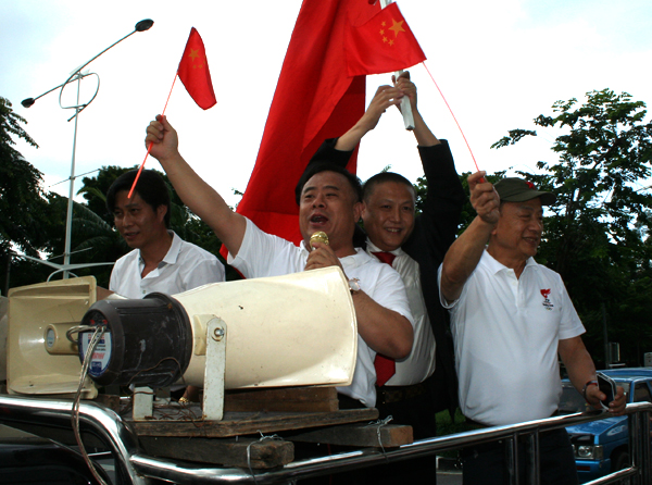 李桂雄会长 ,王志民会长伉俪、副会长谢崇通、钟和武;会长助理胡坚毅、连剑丰;常委许俊龙、文杰挥舞五星红旗,高呼“还我河山,爱我中华”。