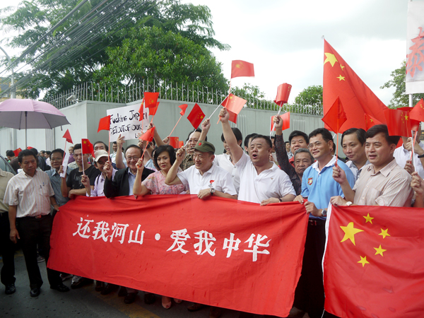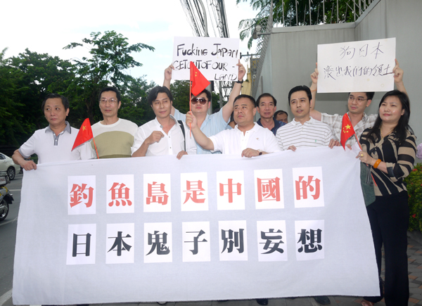 2012年9月11日(星期二)下午,李桂雄会长率领副会长邝锦荣、李嘉淳、谢崇通、钟和武、蔡上新;会长助理王少青、胡坚毅、连剑丰、许少玉、杨艳峰;秘书长时磊;常委张楚南、马旭森、许俊龙、张柱、蔡孝兴、徐位江、文杰、郭育辉;执委谢静;总干事黄成等,带着满腔义愤,站在泰京天线电路日本驻泰大使馆门前,挥舞着中国五星红旗,拉开大幅抗议标语,振臂高呼:“打倒日本军国主义”,“日本侵略者从中国神圣领土滚出去”,“钓鱼岛是中国的神圣领土”“还我河山,爱我中华”!雄壮的“义勇军进行曲”和口号声此起彼伏,飘向大地,直冲云霄。群情激愤,场面热烈,令人感动振奋。大家一致认为:中国的领土主权不容侵犯!钓鱼岛是中国的,不可分割。希望在中国政府和全球华人的共同努力下,让日本政府知难而退,“还我钓鱼岛”!