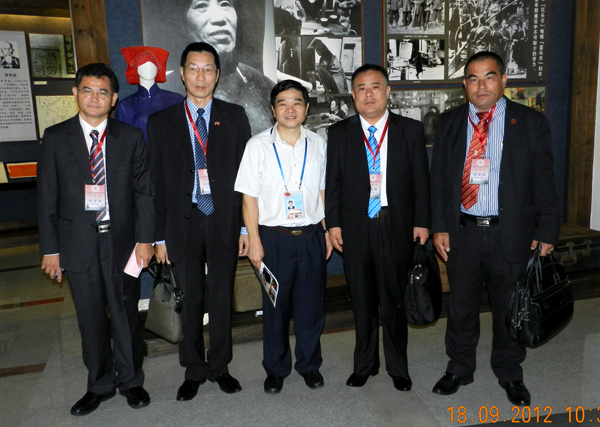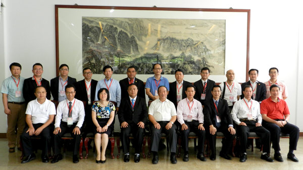 广东省华侨博物馆馆长王明惠(中)与青商会会长李桂雄,(右二)、副会长邝锦荣(左二)、谢崇通(左一)、张创标(右一)等合影。