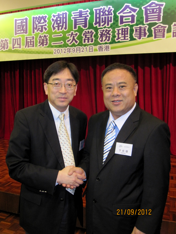 国际潮青联合会第四届第二次常务理事会议于2012年9月21日,在香港召开。泰国华人青年商会李桂雄会长出席会议,与来自世界各国和地区潮青委员欢聚一堂,亲切座谈,共商国际潮青联合会兴革发展大计;气氛融洽,场面热烈。