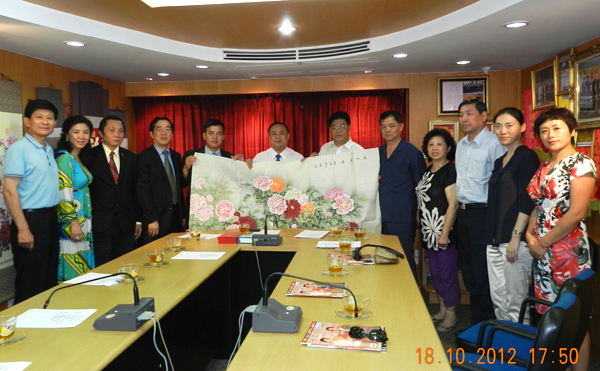 中国山东省人大常委会秘书长王文升常委率领山东人大代表团,成员:南兵军(山东省人大常委),饶曼妮(山东省人大常委兼山东省人大民族侨务外事委员会副主任委员),孔青(全国人大代表、山东能源集团有限公司副总经理),戴惠军 (山东省人大常委会办公厅外事办公室主任),林楠(山东省外办友协处主任科员),王霞(山东服装学院外办主任)一行,于2012年10月18日(星期四)下午访问泰国华人青年商会。