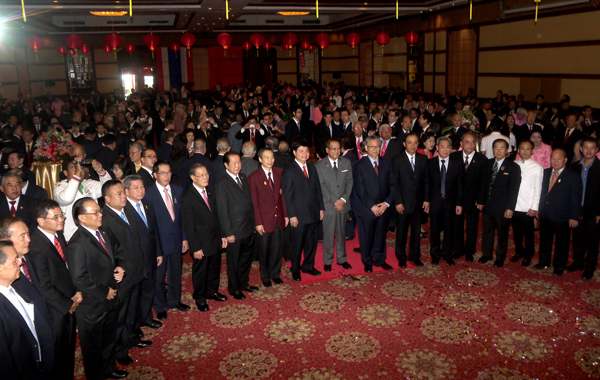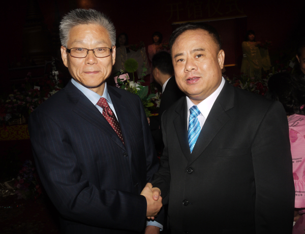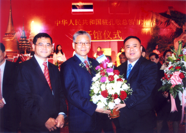 2012年10月23日上午,中国驻孔敬府总领事馆假孔敬府许三大酒店隆重举行开馆典礼仪式,泰国华人青年商会会长李桂雄、副会长谢崇通等应邀参加仪式,并祝贺谢福根先生荣任首任总领事。图为:李桂雄会长献鲜花予中华人民共和国外交部副部长谢杭生表示热烈祝贺。