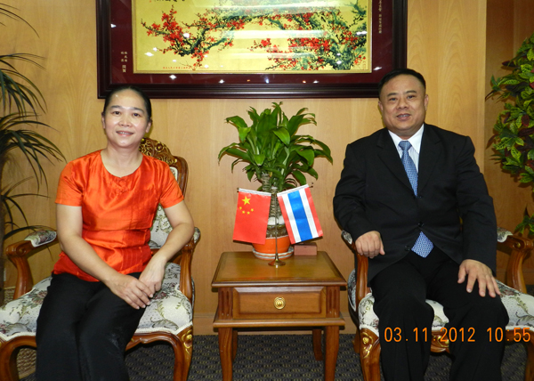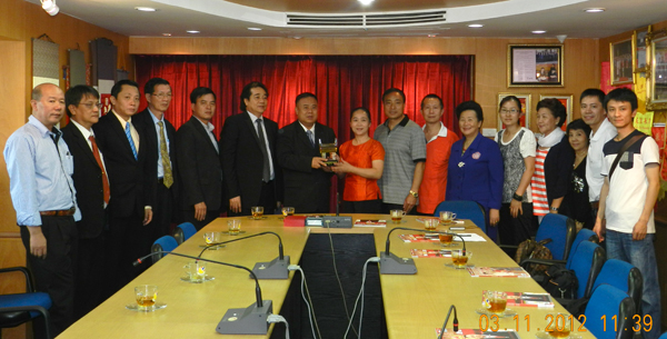 中国云南省归国华侨联合会代表团团长周碧奋副主席率团员郜国志(云南省统战部民族宗教处调研员),蔡福海(云南省侨联办公室副主任),许元华(云南省曲靖市侨联副主席),尹来(云南省侨联干部)一行,由泰国云南会馆永远名誉理事长欧阳嘉运,理事长赵治媛,副理事长闪耀兴、王桂兰,理事闪月美及总干事李志云陪同,于2012年11月30日上午访问泰国华人青年商会,抵达时,受到李桂雄会长及副会长李荣、钟和武、主任许俊龙、张柱,总干事黄成热情迎接,亲切座谈并互赠纪念品合影留念。