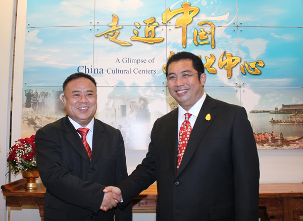 泰国文化部部长颂他耶‧坤本与李桂雄会长于“曼谷中国文化中心”亲切会见时影。