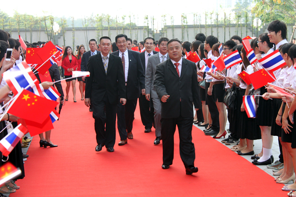 泰国华人青年商会会长李桂雄、副会长陈玉宝;泰中文化艺术交流中心主席蔡义批、副主席王慧、秘书长钱丰步入“曼谷中国文化中心”受到中国留学生的热烈欢迎。