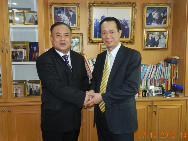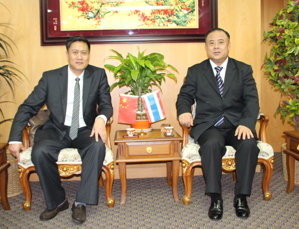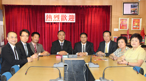 中国贵州潮汕商会会长、贵州蓬赛斯房地产开发有限公司董事长萧群青,中国全国政协委员、中国贵州潮汕商会名誉会长、泰国华人青年商会海外顾问、裕通实业控股集团董事长张钦洲、张翁秀音伉俪,广东潮商会常务理事郑木荣,中国广东省人大代表、裕通实业控股集团总裁张东侠,董事长助理魏淋一行,于2012年12月7日(星期五)下午访问泰国华人青年商会。抵达时,受到青商会李桂雄会长等热情迎接,进行亲切座谈交流。