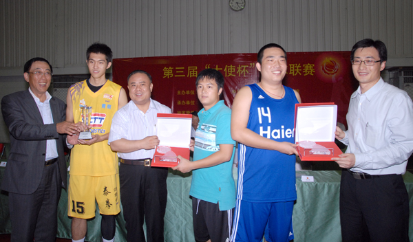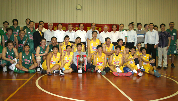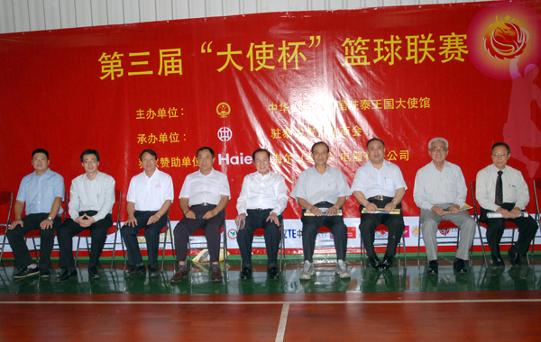 友谊第一,比赛第二。为推动侨界和谐,由中国驻泰大使馆、泰国中资企业商会、泰国华人青年商会联合主办的第三届“大使杯”篮球联赛经过两个月四十轮的比赛,总决赛于2012年12月7日下午2时,在中国驻泰大使馆运动馆隆重举行,经过紧张激烈角逐,泰国华人青年商会代表队技高一筹,以61比55战胜了开泰银行代表队,捧走冠军杯。出席主持决赛开球礼和颁奖仪式的领导有:中国驻泰王国大使馆管木大使,泰国中华总商会刘锦庭主席,泰国潮州会馆蔡汉强主席,泰国中华总商会副主席、青年商会会长李桂雄,泰国中资企业商会会长、中国银行总经理车军,中国驻泰王国大使馆高文宽参赞、方文国参赞、孙渊鲲参赞、正大集团副总裁洪钧涛等。