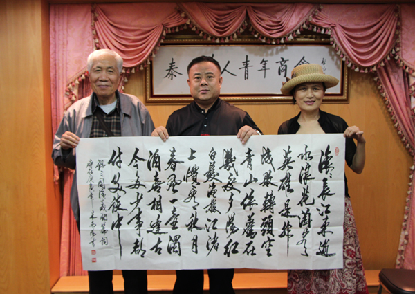 中国书画家联谊会外联部孙怡副部长于2013年1月2日下午,访问泰国华人青年商会,受到李桂雄会长、许俊龙主任的热情接待。宾主亲切交谈,气氛融洽。最后,孙怡副部长(右)赠送署名书法家米南阳墨宝予李桂雄会长(中)。