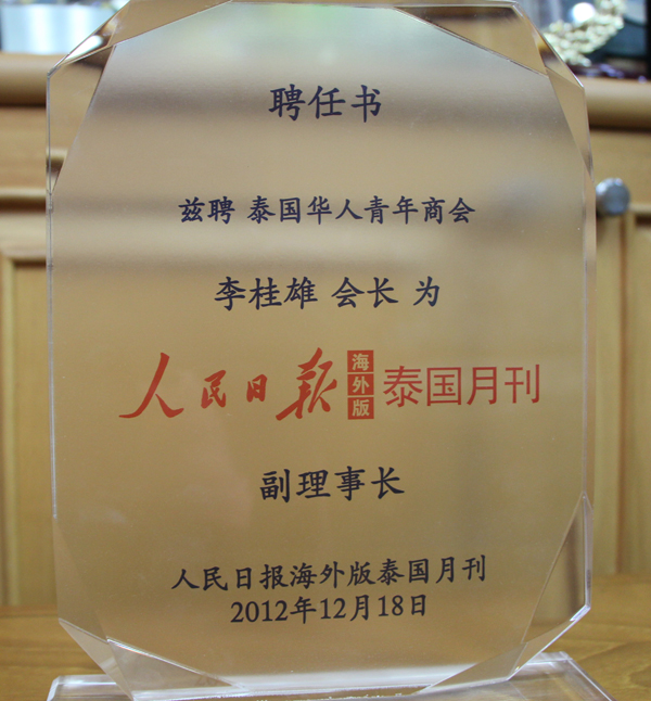 2013年1月17日下午,人民日报海外版泰国月刊张子贤主编与李晶磊主编助理于泰国华人青年商会会址采访李桂雄会长,并聘请李会长为泰国月刊理事会副理事长。