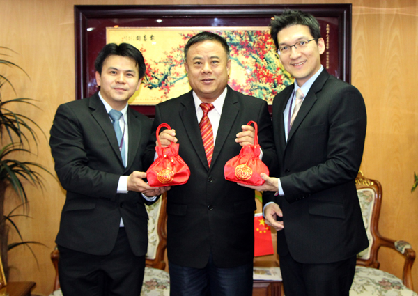 2013年2月1日下午,泰国汇商银行国际业务部执行副总裁严贤铭先生偕该部商业分析师杰帝鹏先生抵泰国华人青商会向李桂雄会长恭贺新年,受到李会长的热情接待,宾主进行亲切交流。