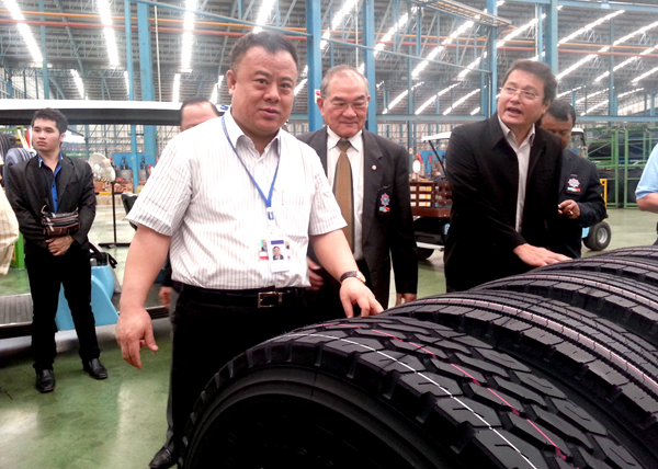 二 0 一三年二月二十七日,泰国华人青年商会会长李桂雄前往泰国佛统府访问考察泰国最大的轮胎生产基地——安达利(OTANI)轮胎厂,受到该厂董事长、泰国华人青年商会名誉会长林文桂先生的热情接待。