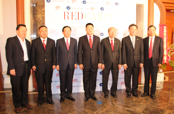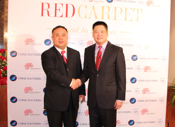 二 0 一三年三月廿五日,泰国中华总商会副主席、泰国华人青年商会会长李桂雄应邀出席在曼谷律实他尼大酒店举行的南方航空公司曼谷办事处举办的“鲜红地毯成功直往”答谢晚会。宴会上,曼谷办事处经理岑岭先生与李桂雄会长握手座谈,场面亲切,温馨欢乐。