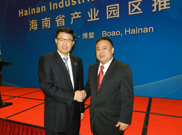 海南省省长蒋定之(左)与李桂雄会长在海南省产业园推介会上。