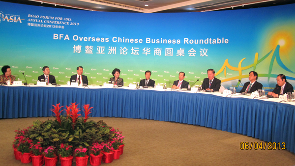4月6日下午,博鳌论坛华商圆桌会议在博鳌国际会议中心一层东屿宴会大厅举行。会议召集人是中国侨商会会长谢国民先生,主题为“华商推动亚洲共同发展”。来自世界各地的30位华商领袖代表;中国国务院侨办主任裘援平、副主任任启亮以及来自世界各地的华商代表30人参加了会议。