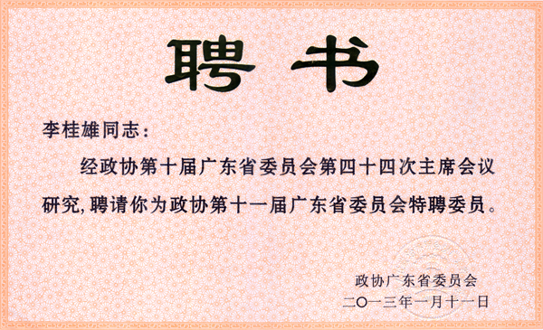 本会会长李桂雄于2013年5月6日出席政协第十一届广东省委员会外事侨务委员会第一次全体委员会议,开会地点:政协大厦三楼会议厅。会议由外事侨务委员会吴锐成主任主持,政协副主席王珣章颁发特聘委员证书予李桂雄委员。
