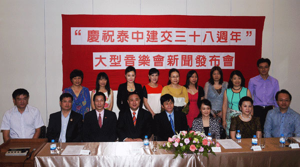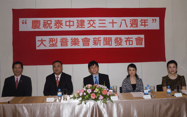 2013年6月9日下午3时,“庆祝泰中建交三十八周年”大型音乐会新闻发布会假曼谷中国文化中心举行。 “庆祝泰中建交三十八周年”大型音乐会,由广东省文化厅主办,泰国华人青年商会、曼谷中国文化中心、泰国广肇商会、泰中艺术家联合会承办。支持单位有:中国驻泰国大使馆、广东省人民政府、泰中友好协会、泰国中华总商会、泰国潮州会馆。演出单位是广东省民族乐团,演出地点在曼谷中国文化中心。演出时间为2013年6月24-25日两天,24号晚7:30开始,主要安排泰国侨团及业余演出团体出席观摩。25号晚7:30,主要安排泰国政府官员、广东省人民政府领导、中国驻泰大使馆领导和泰国各侨团的主要领导参与盛会。