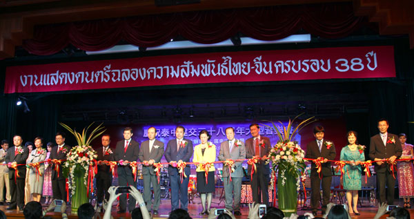 致辞结束后举行了隆重的剪彩仪式,泰国文化部部长颂他耶.坤本阁下、中国驻泰王国大使馆特命全权大使管木阁下、广东省人民政府副省长招玉芳阁下、泰中友好协会会长功.塔拍兰氏阁下、泰国中华总商会刘锦庭主席、泰国潮州会馆代主席黄迨光博士、泰中艺术家联合会蔡义批会长、广东省文化厅方健宏厅长、中国驻泰王国大使馆秦裕森文化参赞、泰国驻广州总领事梅碧珍女士、曼谷中国文化中心兰素红主任、大会主席李桂雄先生、大会执行主席邝锦荣先生上台主持剪彩。
