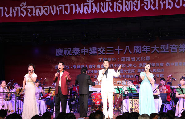 隆重的剪彩仪式后,艺术家们开始正式演出,担纲司仪的是有着泰华金话筒美誉的方舫和泰国第五电视台著名主持人阿诺。来自中国广东的艺术家为大家献上了精彩的节目。本次音乐会指挥是国家一级指挥张烈。“南国鼓王”陈佐辉团长的中国民族鼓乐、青年二胡演奏家曹玉荣的民族管弦乐演奏、达到了“人琴合一”的境界,优秀琵琶演奏家缪晓铮名不虚传为“广东琵琶第一人”,弹奏的《送你一支玫瑰花》,令在场观众如痴如醉。四位著名的歌唱家刘东红、陈前、常安、唐彪演唱的都是大家耳熟能详的歌曲,整台音乐会掀起一个又一个高潮,观众们都忘情跟着一起唱。艺术家们演唱泰皇陛下御作《雨丝》、《黎明》,表达了中国人民对泰皇陛下的崇敬,对泰国人民的深厚友谊。在一曲《明天会更好》的歌声中,音乐会结束。此次观看演出领导嘉宾有:泰国文化部部长顾问素威蒙女士、泰国文化部副次长曾素拉女士、泰国文化部国际友好司长拉鲁尼女士、泰国国家旅游局沙腊宋副局长、泰国国家旅游局东亚司司长占暖女士、泰国外交部经济司副司长隆玛尼女士、刘暹有、陈卓然、林楚钦、刘秉青、陈金苞、马逸群、张镇松、张朝明、吴金城、叶沐强、何国忠、余东海、鲁文明、胡坚毅、钱丰、王少清、陈贤得、孙丽玲、王易、许俊龙、吴育雄、王维和、许勇敢、李镇文等。