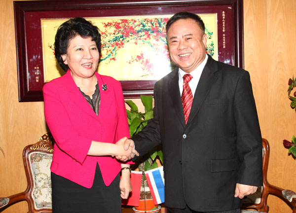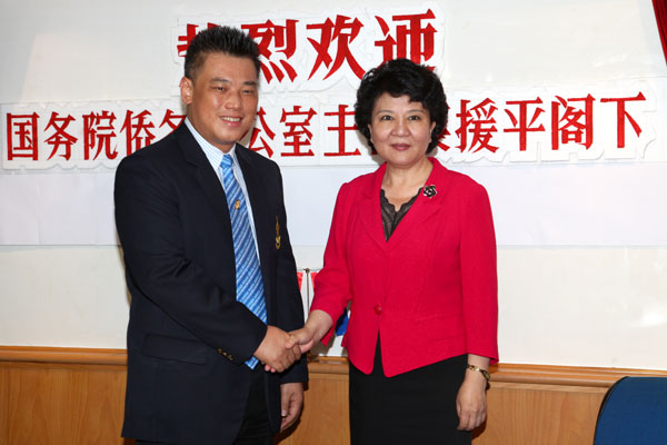 裘援平主任带着和蔼的笑容,语重心长地致词,她说:很高兴我们国务院侨务办公室代表团到泰国访问期间,能有机会到青年商会来,带来了国务院侨办对大家的诚挚问候,也带来了祖国和祖籍国的人民对大家的惦念之情。我知道泰华青年商会成立十三年,是改革开放以后,从中国各个省市、自治区来到泰国的新华侨新移民当中的青年企业家和社会各界精英的组织团体。新华侨新移民有一个特点是:带着知识、资金、经营经验来的。起点比较高,而且善于学习、善于借鉴,积累老一辈华侨的坎坷发展历程换来的经验,甚至教训,既继承传统,又能结合新的形势,不断地开拓创新,相对来说,短时间内就能在泰华社会站住了脚,成功地容入了泰国的主流社会,实现了发展,组成了华人青年商会,并让这个组织成为刚到泰国的新华侨新移民的依靠,给予他们多方面的支持和帮助,维护他们的合法权益,积极帮助他们实现在异国他乡长期生存和发展的梦想。同时又在大家逐步发展起来之后,为他们相互加强交流、沟通、合作和联谊提供了一个良好的平台。我跟李桂雄会长已经很熟悉了。我注意到李会长是一位很善于团结商会各位同仁,很善于加强商会与其他侨团组织之间的关系,为青年商会的发展营造了比较好的环境和外部条件。看到商会满满的活动相片和纪念品,我觉得,李会长广泛的人脉关系对青商会未来发展非常有利。这也从侧面反映出青年商会以一种新时代新的眼光、新的眼界去发展我们商会的各项事业。多年来,青商会的企业家不仅成就了自己的事业,而且积极地促进泰国社会的发展,促进中泰两国友好、经贸、文化、教育等各个领域的交流合作。另外,大部分成员还在祖国家乡积极参与经济建设,投资兴业,开展文化交流、传媒等,在促进国内发展起到了非常重要的作用。实现中华民族伟大复兴的中国梦,是海内外中华儿女的共同梦想,而这个梦已逐渐在实现。现在的中国经济实力强,繁荣昌盛,我们的综合实力和国际地位与日俱增,国家的影响力不断扩大。祖国的强大会为海外侨胞提供坚强的靠山和强有力的支持。希望泰国华人青年商会的企业家们发挥自己特有的优势和特色,继续促进中国与泰国两国之间政治关系、经贸关系、文化关系,包括华文教育,也就是中华优秀文化在泰国的传播;为中泰两国的经济社会发展,继续发挥你们的作用。为中国与泰国两国的繁荣、稳定、和谐做出应有的贡献。其中一项最重要的工作就是促进祖国的和平统一,推动海峡两岸关系的和平发展。我们的祖国应该逐步走向统一,走向团结,走向繁荣和富强,而这需要大家付出方方面面艰辛的努力。我知道如李桂雄会长般的海外侨胞在这方面做了大量实实在在的工作,这正是我们国家发展所需要的。实现“中国梦”不是做梦做出来的,是干出来的,是靠大家一块帮持着,一块共同往前推进,才能够实现的。要特别强调的是:作为新侨民的商会组织或侨团组织一定要维护团结。没有团结,就没有侨胞在这个地方长期发展的良好基础,中国人和中国人之间没有过不去的槛、解决不了的问题。我们要在泰侨团当中做出样子来,就是大家团结,相互帮助,共同发展。最后,祝愿泰国华人青年商会越办越好;全体会员事业如日中天。