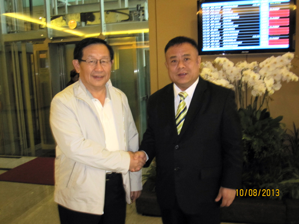 中国全国政协副主席、中国致公党主席、中国科技部部长万钢阁下率团访泰,于2013年8月10日中午抵达泰国机场,受到了泰国中华总商会副主席、泰国华人青年商会会长李桂雄的热烈欢迎。图为万钢主席与李桂雄会长见面时亲切握手交谈。