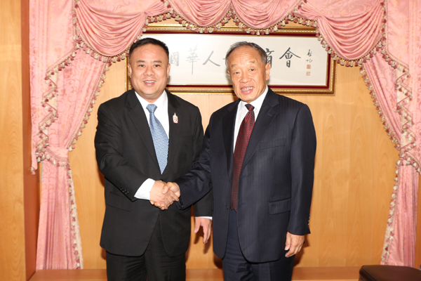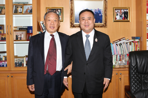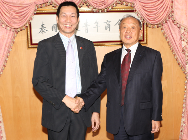 在热烈的掌声中,李桂雄会长接着向客人介绍青商会的发展历程、成员来源、创会宗旨以及做出的努力、取得的成绩。他指出:青年商会的成员大部分是来自祖国各省市、自治区的旅泰新华侨新移民。十三年来,大家都与祖国有经贸往来,积极投资家乡建设,在泰弘扬中华优秀文化,为泰中两国的友好、文化交流、经贸合作,特别公共外交事务及和平统一事业,贡献出了力量,得到泰中两国政府、各侨团首长、新老华侨的好评和肯定。接着,李桂雄会长回忆起八年前,秦小梅慈善大使作为泰中友好使者抵泰主持“泰中建交30周年大型纪念画册”新闻发布会,受到泰华社会的关注。泰华青商会对“泰中建交30周年大型纪念画册”的编印和发行给予大力支持和配合,并提供有关数据,使编印工作顺利进行。李桂雄会长说:泰国是华侨最多的国家。泰中一家亲已深入两国人民的心,而这个成果要归功于像李肇星会长、秦小梅慈善大使一样的中国外交官和中外友好使者。李肇星会长也多次访问泰国,为泰中两国的友好、合作发展做出了巨大的贡献。李肇星会长永远是我们心中卓越的外交官,此次访问泰国,意义更加重大,必能使广大华侨树立信心,更加爱国爱乡;使泰中两国的友好关系进一步加深、加固。今天李肇星会长来看望我们新华侨新移民,是给予我们的鼓励。我们要认真、努力向李肇星会长学习,在海外把公共外交工作做得更好,进一步推动两国公共外交事业的发展。中国强大,是我们最大的愿望和动力。实现中国梦,也是实现华侨的梦。所以,让我们共同努力,创造条件,实现我们伟大的梦想。最后祝代表团访泰圆满成功,取得丰硕成果;祝大家身体健康、万事如意!