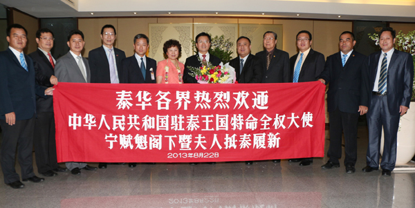 2013年8月22日晚,中华人民共和国新任驻泰王国特命全权大使宁赋魁暨夫人初庆玲女士抵泰履新,泰华各界侨领到素旺那奔国际机场欢迎,泰国华人青年商会到机场迎接的有会长李桂雄、副会长林嘉南、邝锦荣、宁禾、林兆祥、张创标、钟和武、黄懿光、总干事黄成等。