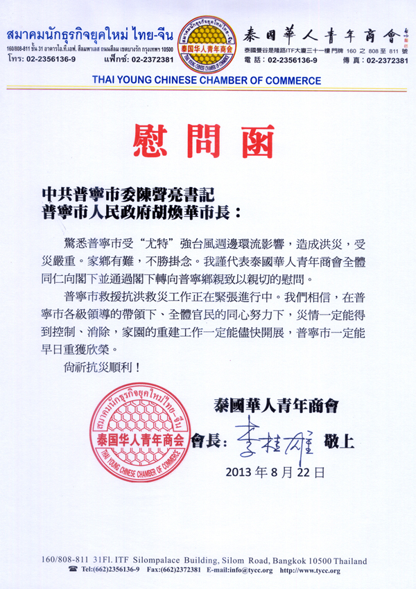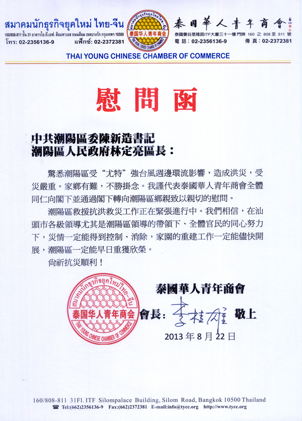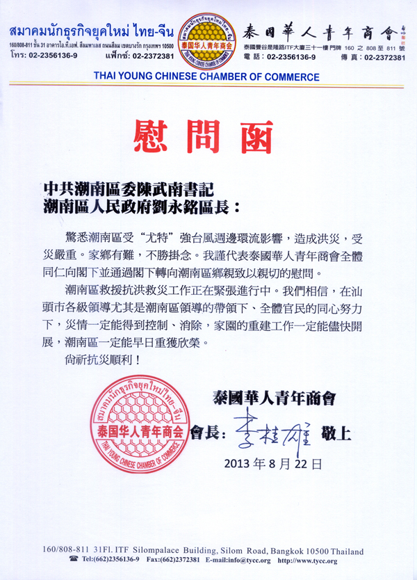 目前,祖国广东省普宁市、潮阳区、潮南区遭受洪水灾害,人民生命财产造成巨大损失。家乡有难,不胜挂念,泰国华人青年商会在会长李桂雄的率领下,积极伸出援助之手、献出爱心,向普宁市、潮阳区、潮南区各捐赠救灾善款泰币100万铢,共捐出善款300万铢,并表达泰国华人青年商会同仁对灾区人民的关心和亲切慰问之情。