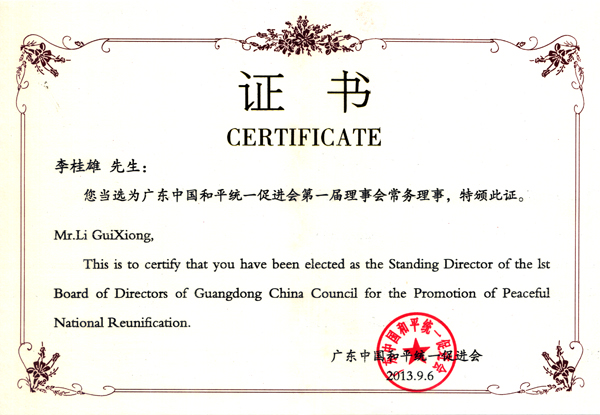 2013年9月6日,广东中国和平统一促进会成立大会,于广州珠岛宾馆举行,广东省委副书记、广东省政协主席朱明国,广东省委统战部部长、广东中国和平统一促进会会长林雄等主持会议。泰国华人青年商会会长李桂雄当选为常务理事、副会长张创标、庄基锋;会长助理王少青为理事。