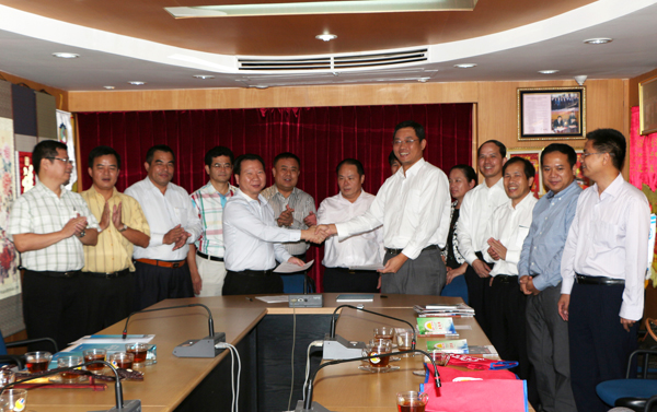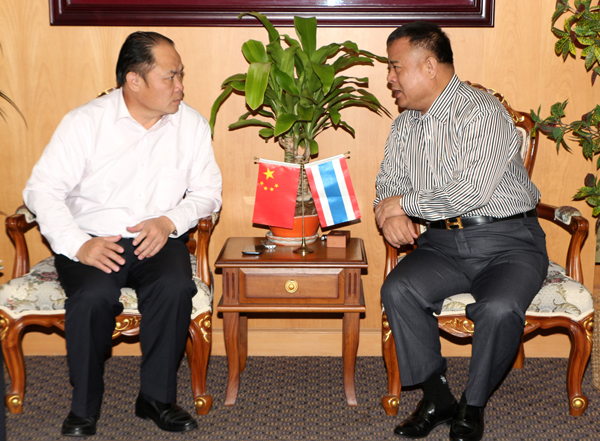 据黄克书记介绍和从代表团一行带来的资料获悉:崇左市在“一轴两翼”中具有重要的战略地位,距广西首府南宁90公里,距越南河内280公里,距泰国曼谷1700公里。南宁—崇左—河内—那空帕侬府—曼谷—新加坡,是中国沿海、华东、华南地区联系对接东盟国家最便捷的陆路运输通道。崇左是中国的“糖都”、中国的“锰都”和中国的“边贸之都”。崇左市政府于去年与泰国城乡发展基金会签订合作协议,双方合作共建中国—泰国(崇左)产业园,努力将其打造成中泰合作园区的典范——“陆路东盟新高地,中泰合作示范区”,建成中国最大的制糖食品加工基地、南宁——新加坡经济走廊上中泰两国共同推进产业合作的重要平台。黄书记说,在崇左建设中泰(崇左)产业园,并上升为中泰两国政府层面合作的园区,可以有效促进泰国东北部的工农产品以国际贸易方式进入中国市场。可以预计,到2015年中泰双边贸易额有望达到1000亿美元。