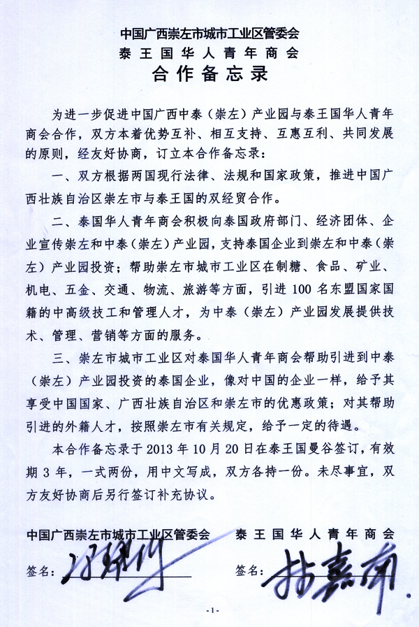 最后,在泰国华人青年商会李桂雄会长与广西崇左市黄克书记的共同见证和指示下,青商会林嘉南副会长代表泰国华人青年商会与崇左市工业区管委会冯耀辉主任签署了《中国广西崇左市城市工业区管委会、泰国华人青年商会合作备忘录》。