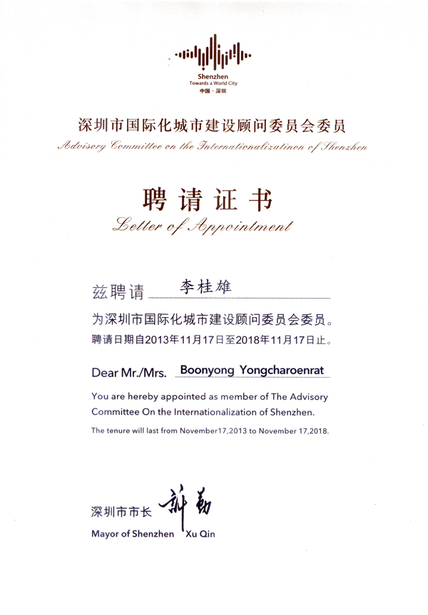 2013年11月18日,继连续两年成功举办“深圳国际化城市建设研讨会”后,中国深圳市人民政府外事办公室联合深圳特区报社、北京大学深圳研究生院、招商银行举办“2013深圳国际化城市建设研讨会”。深圳市委王荣书记出席大会并致辞。会议由深圳市许勤市长主持。泰国中华总商会副主席、泰国华人青年商会会长李桂雄作为深圳国际化城市建设顾问委员会首批聘任的顾问委员出席了此次活动,与来自美国、泰国、匈牙利、香港等地的20多名海内外专家齐聚一堂。大家围绕“建设法治化国际化营商环境”主题,为深圳的国际化建设“把脉”。