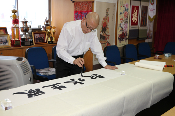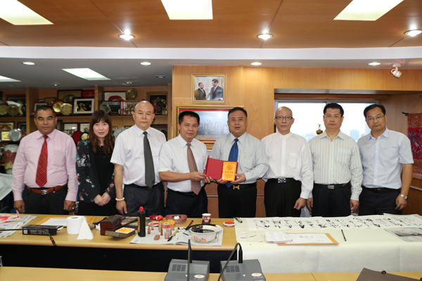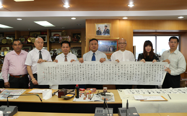 宾主亲切交谈,气氛融洽。崔仁辉教授即兴欣然提笔,于现场挥毫多幅墨宝,并赠送予李桂雄会长及青商会企业家收藏。崔教授漂逸的书法和深厚的功底,引来在座一片赞叹。李桂雄会长表示,中国书法是一门古老的艺术,是中华文化的灿烂之花。代表团此行,意义重大,特别是崔教授精美的书法,对推动中国书法文化艺术走向国际,促进泰中文化交流,增进两国人民之间的友谊,发挥新的积极作用。同时对中国书法进一步向海外宣传普及,具有更广泛而深远的现实意义。最后,李会长真诚祝愿代表团此次抵泰成立“华南师范大学泰国校友会”任务圆满成功,诸事顺利。