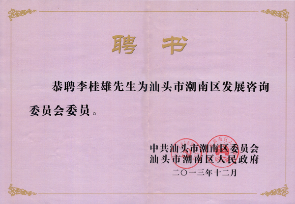 2013年12月14日(星期六),第二届(潮南)内衣家居服装节经贸活动暨建区10周年庆典活动,假潮南区党政综合办公会议中心隆重举行,区长刘永铭先生主持会议,中共潮南区委书记陈武南先生致词;中国纺织工业联合会副会长陈文英、汕头市副市长林依民先后发表讲话。当天上午,该活动相继举行了纺织服装企业订货签约仪式;举行潮南区纺织创新基地城市设计方案做出最佳设计者颁奖仪式;举行潮南重点项目和投资项目签约、奠基、竣工集中剪彩仪式;举行潮南区纺织服装产业发展高峰论坛等。下午举行了潮南区发展委员会成立大会暨潮南区总体规划经编情况报告会,由区委常委、区人民政府常务副区长周昭勇先生主持,区委郑凯舟副书记宣读关于潮南区发展咨询委员会成立有关文件及委员名单。区委区政府陈武南书记、刘永铭区长向各位参会委员颁发证书。本会名誉会长、泰国中华总商会永远荣誉主席吴宏丰、会长李桂雄、常务副会长黄增滨、顾问马伟鹏等45位海内外潮南籍知名人士,德高望重、学识渊博、情系桑梓、泽被家园,为家乡潮南区的繁荣发展做出了贡献,故荣获潮南区区委、区政府诚聘为该咨询委员会委员。