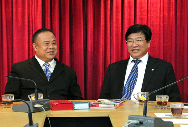 李桂雄会长首先简介了青年商会的成立历程、宗旨以及促进在泰中两国友好往来、文化交流、经贸合作中所起到的作用和取得的成绩。特别是在支持海外华文教育方面做了系列工作。他认为施校长此行不但增进了彼此的了解和感情,而且进一步加深了泰中两国的友谊,对两国的文化、经贸各方面都有积极的推动作用。李会长说:施校长的来访意义重大。泰国虽然正处政局不稳之时,但泰国华侨华人众多,也是经济政治上的主流,对泰中友谊的政策和泰中经济贸易往来是稳定和不会改变的。他寄望中国对外经济贸易大学这所中国教育部直属的全国重点大学、海外学子梦寐以求的学府,能为泰国华侨子女提供更多优惠的学习机会和条件。他说:希望施校长要更加重视、支持泰国侨胞的子女到中国外经贸大学留学。放宽政策,让华侨华人的子孙能到中国读书,学习中华文化和中国语言,是全体海外华人侨胞的心愿。青年商会很乐意从中牵线搭桥,充当平台。使“泰中友谊之桥”在双方的努力下,变得更加宽广。最后,李会长祝愿施校长访问泰国取得丰硕成果在座各位新年快乐,家庭幸福,万事如意。