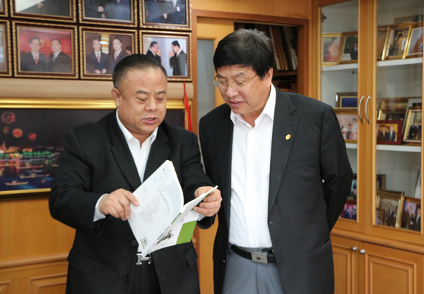 李桂雄会长与施建军校长一起阅览大学生教材《人文素质修养》。
