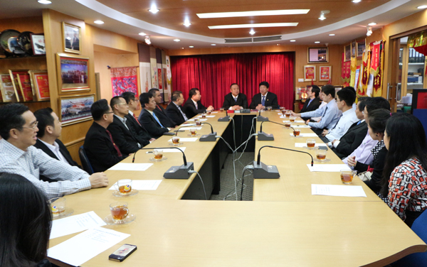 2014年1月23日下午,中国对外经济贸易大学校长施建军;国际学院院长韩维春;校长秘书孟源;国际交流合作处科长李小萌;国际学院学生事务科科长李勇一行访问泰国华人青年商会,受青商会会长李桂雄,常务副会长林嘉南,副会长张创标、钟和武、黄懿光,会长助理叶沐强、王少青、尚延明,顾问萧庆良,盘谷银行资深副总经理马化威,正大管理学院国际学院院长汤之敏,青商会主任许俊龙、王易,常委潘福安,张悦杰,执委潘卫娣,总干事黄成等的热烈欢迎。双方举行了活跃感人的座谈会。