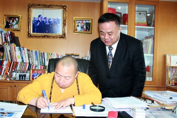 李桂雄会长怀着十分激动的心情致欢迎词。他代表青年商会全体成员热烈欢迎印顺大师的莅临,感谢大师一直以来对青年商会的关爱和重视。接着,简要介绍了青年商会的概况。李会长说:青年商会与中国国务院侨办、侨联、统战部、全国青年联合会、企业家协会等以及各省市涉侨单位关系密切、来往频繁。青商会的成员大部分为来自祖国各省市、自治区,中国改革开放后三十年来的旅泰新华侨新移民,少部分为泰籍第三四代华裔。经过大家多年的共同努力,如今青年商会的步伐已逐渐与老一辈华侨接轨。青商会地方虽小,但几乎每天都有各地嘉朋来访。今天印顺大师及代表团的来访,我认为意义十分重大,是一个新的里程碑。印顺大师是佛教界的得道高僧,是中国大陆首位荣获泰国国王御赐“华僧大尊长”荣誉称号的修行者。印顺大师是泰中两国佛教界文化交流的使者,为泰中佛教佛学交流和合作做出了很大的贡献。大师对泰国的友谊深厚,时刻关心泰国的情况。特别是当年大师亲临泰国的受水灾地区,对灾区人民予以关心、慰问和援助,充分体现出一位华僧大尊长救苦救难、乐善好施的高尚风范,让无数泰国人民、广大华侨华人感动。我相信这将永远记录于泰中友好史上。华僧大尊长,家喻户晓。今天抵泰国华人青年商会访问,令泰国华人青年商会蓬荜生辉。不但给我们带来极大的鼓励,而且定会给我们带来好运。因为刚才大师进门之时,我已感觉到一股吉祥之风随大师而至。再次感谢大师的莅临。祝愿大师及代表团今日返回祖国一路平安、一切顺利。同时向代表团各位拜个晚年,祝大家:身体健康、万事如意。最后,李会长以一声“阿弥陀佛”作为结束语,聊表对印顺大师的崇敬之情。