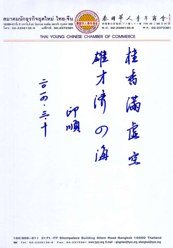 在热烈的掌声中,印顺大师则以一声“阿弥陀佛”开头,发表了语重心长的讲话。他说:今天总算是到桂雄这边来了。他每次回国,我们都会聚一下。要是遇到从泰国这边过去的人,我也会向他们打听桂雄的近况如何、泰国的情况怎样。桂雄能有这么大的心量、能力,组织这么大的一个团体来推动中泰两国友谊、文化交流、商贸发展以及各界的沟通,而不厌其烦。说实话,干这个“活”,是一件吃力不讨好的事。他这么多年来,坚持来来回回,两地穿梭、奔走,牵线搭桥,推动、引导,实在很了不起。所以,我一直从心底里赞叹他。一个社会、一个国家、一个民族,青年代表的是时代的未来;代表的是一个国家和民族的未来。我相信中泰两国的人民在你们的共同推动、努力下,肯定会越来越好,永远都好。泰国是个佛教国家,几乎人人都拜佛信佛。特别是潮汕人,世世代代都是信佛的。一班信佛的年轻人,发挥这么大的毅力,汇集这么多的正能量,我想,这对整个世界的年轻人、对世界的年轻人团体来讲,都是一个很好的引导。可以说是一股强大的凝聚力。社会发展这么快,在人心浮躁的情况下,我相信有佛法就有办法。有这么多的一批年轻人来学佛、来行佛,不但能得到佛菩萨的加倍庇佑,而且能够给很多年轻人做出很好榜样,起表率作用。希望能让更多的人来学习佛法,来推动佛法,来弘扬佛法。我们当下的世界就是净土,我们当下的世界就是极乐的世界,我们当下的国度就是佛的国度。我们每个人天天都是在不断地创造、改变自己。我们年轻人的信仰,是时代的信仰、脚步、方向。我刚才给桂雄题了两行字“桂香满虚空,雄才济四海。”年轻组织,不单对泰国、中国的青年,包括对整个世界的年轻人,都要引导他们、鼓舞他们,真正来为这个社会注入正能量,为这个社会创造出更多更大的奇迹。把当下我们这个世界变成佛的世界。我们每个人都是佛,都是菩萨,每个人都可以成功。同时希望围绕在桂雄身边的泰国青年,乃至世界各个领域的青年、所有的人都能够身体健康、工作顺利、心想事成、一切吉祥如意、万事顺利、永远顺利,并且能够发展无量,发心无量,成就无量。阿弥陀佛!