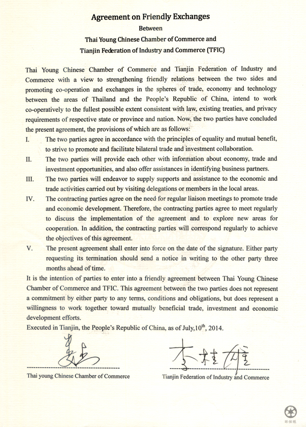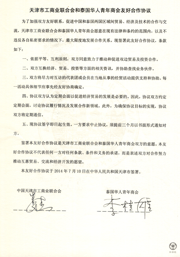 10日,在由天津市人民政府侨务办公室、天津市商务委员会、天津市工商业联合会、天津东盟经贸合作促进会主办的“天津-东盟华商经贸合作洽谈会”上,来自泰国、越南、柬埔寨、日本、韩国、澳大利亚及香港、澳门、台湾等11个国家和地区的近百余海外侨界工商人士参会与天津市工商界人士洽谈合作。李桂雄会长代表泰国华人青年商会,分别同天津市工商业联合会、天津东盟经贸合作促进会签署了友好合作协议。