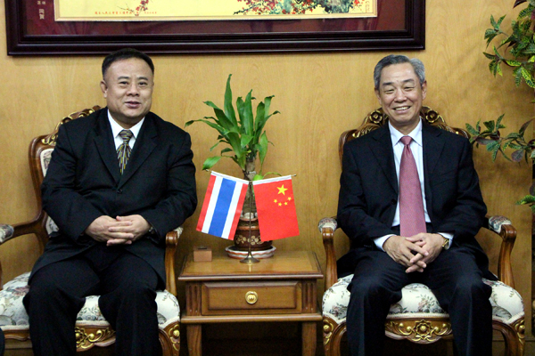 接着,谢总领事详细介绍了泰国东北部的情况。孔敬属泰国东北部,东北部人口占泰国三分之一,地大人多,农业发达,经济社会发展迅速。泰国政府把东北部作为国家经济发展的重要区域,给予很多政策的扶持和礼遇,对外商投资的优惠条件也很多。随着东盟一体化的进程加快,中国与东盟各国的合作日益扩大。泰国东北部具有中心地带的优越条件,农产品丰富,发展前途好。希望大家到东北部多到观光考察,增进了解,寻求合作,让泰国东北部企业家与青商会企业家联合起来,为中泰两国的友好、经济发展做出更多的贡献。最后,谢福根总领事说,还是要再次感谢李会长和青商会同仁对我在曼谷工作时的支持和帮助。祝愿青年商会会务蓬勃发展,蒸蒸日上;各位老朋友事业兴旺,心想事成!
