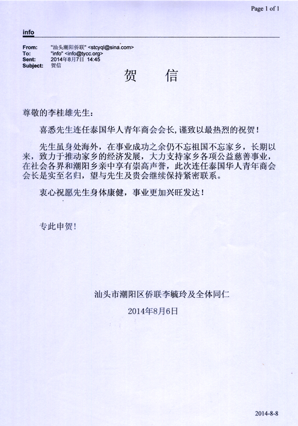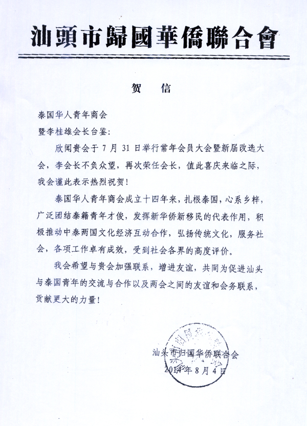汕头市侨联、潮阳区侨联贺李桂雄蝉联青商会第八届会长